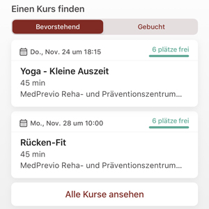 Ab November können Sie angebotene Kurse (Yoga/Rückenprogramm) und die Teilnahme an weiteren Aktionen (z.B. Infoabend Bluthochdruck) über die MedPrevio-App kostenfrei buchen…